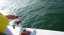 7.仕掛けを下ろしてしばらく待つと・・・竿先がピクピク!! さぁ、巻いて巻いて!!